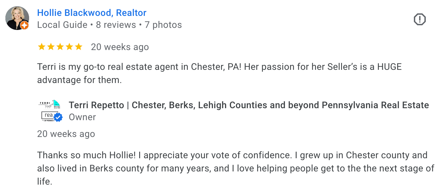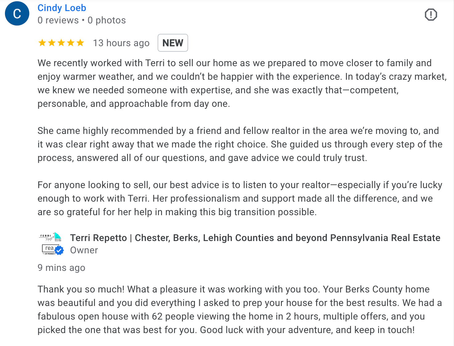 Working with Terri was a great experience. She knows her stuff and knows how to bring you top dollar for your house! How I found her is the best story - i was waiting in line at the Post Office and (as usual) struck up a conversation with the others in line. I was sking questions about the local area, as i had moved to PA almost a year earlier. The very nice lady in front of me mentioned her daughter was a real estate agent and gave me some local information. i asked her to have her daughter get in touch with me, as I had decided I would probably relocate again the following year to get a bit closer to my kids. Terri called me a few days later and we had a long conversation about my house and why i would want to leave it.