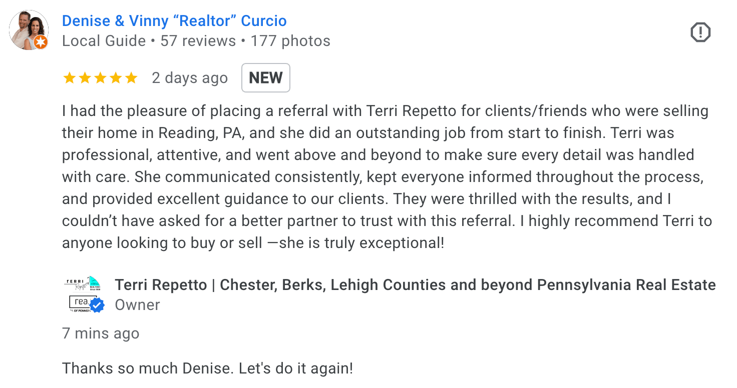 Terri Repetto is the definition of a professional, hardworking real-estate agent and I would without a doubt use her in the future and recommend her to family and friends.